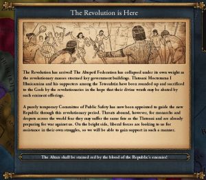 Когда вы становитесь революционной державой, вы получите текст, скорее всего, уникальный, описывающий, как именно ваш народ освободил себя. Caligula Caesar написал множество различных уникальных текстов для нескольких крупных стран по всему миру. Да, по всему миру, поскольку, хотя революция, скорее всего, и случится в Европе, мы не ограничиваем механики этим континентом.